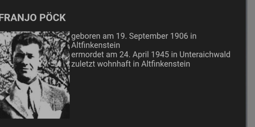 Am 24. April 1945 ging der Partisane Franjo Pöck vlg. Mikul aus Altfinkenstein zu einem Haus nach Unteraichwald. Er wurde von einer Einheimischen verraten und am Rückweg vom Gendarmen Hauser erschossen. An die Kinder der Volksschule Latschach wurde zur Abschreckung Flugzettel mit folgendem Inhalt verteilt: „Der Bandit Franjo Pöck wurde in Unteraichwald erschossen.“