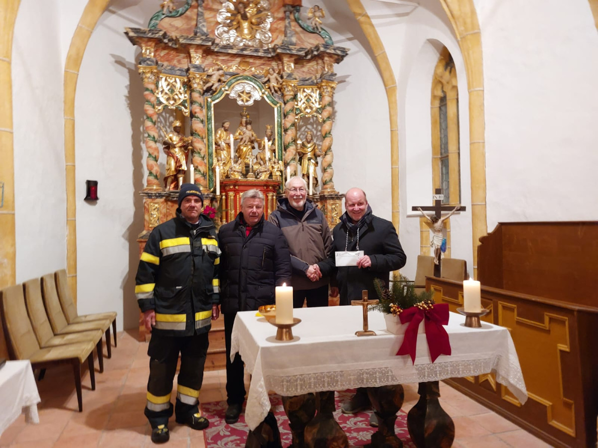 Die vollbesetzte Dreikönigskirche erstrahlte gestern in einem besonderen Glanz. Bei der Messe, die von unserem Pfarrer Stanko Olip gehalten wurde, war die gute Stimmung förmlich spürbar.Heuer war auch wieder eine Abordnung der FF Latschach mit dabei. DGL Obmann Günther Sticker durfte dem Greuther Mesner Erich Logonder eine Spende von 1000.- Euro überreichen. Diese fließt in die Malerarbeiten im Kirchengebäude.Die Spende ist ein kleines Dankeschön an Erich für seinen unermüdlichen Einsatz, welcher die Kirche zu einem besonderen Schmuckstück und Kraftort unserer Heimat macht.