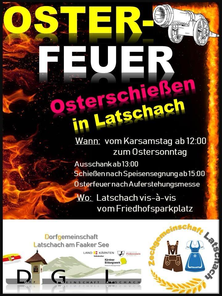 Nach dem Erfolg im Vorjahr wird die Tradition des Latschacher Osterschießens auch heuer wieder fortgesetzt. Die Zechburschen mit ihren Mädchen freuen sich schon über viele Besucher und zahlreiche Unterstützung. Das Osterfeuer wird am Karsamstag kurz nach 20 Uhr, nach dem Erhalt des gesegneten Feuers, gegenüber dem Friedhofsparkplatz auf der Schlosserwiese entzündet.