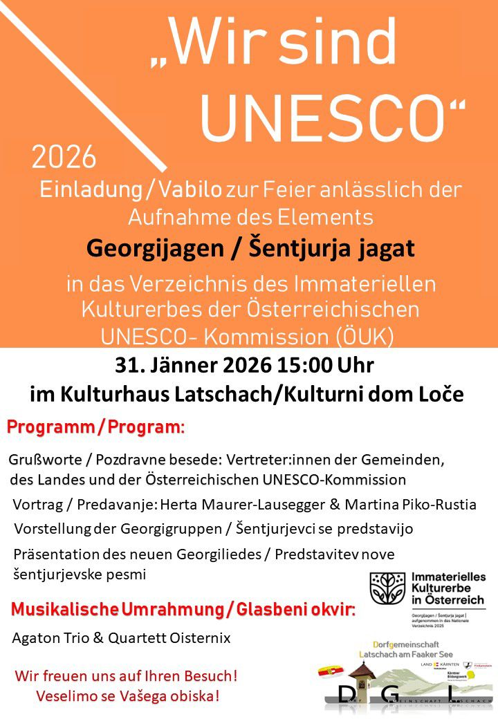 Am Samstag, 31. Jänner 2026 wird es im Kulturhaus Latschach groß hergehen, wenn die Aufnahme des Georgijagens/Šenturja jahat als Immaterielles Kulturerbe gefeiert wird. Viel Musik, ein volkskundlicher Vortrag und ein interessantes Rahmenprogramm warten auf die Besucher. Im Mittelpunkt der Veranstaltung werden die jungen Frühlingsbringer stehen.